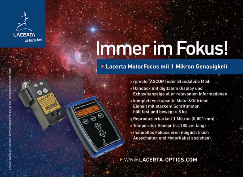 Der MFOC Lacerta MotorFocus ermöglicht eine präzise, reproduzierbare motorische Scharfstellung des Teleskopes über einen Mikroschritt gesteuerten Schrittmotor. Der Motor wird über eine spielfreie Kupplung angeschlossen, alles ist völlig gekapselt. Es ist einerseits ein Standalone System und kommt mit einer Handbox mit digitaler Anzeige, anderseits ist es auch remote verwendbar. Es ist voll ASCOM kompatibel und über USB kommuniziert es mit nahezu allen ASCOM kompatiblen Programmen, V-Kurven und Autofokus sind damit möglich. Das System hat auch im Standalone Modus volle Fähigkeit zur Temperaturkompensation sowie offset Positionen für verschiedene Filter. Mit dem MGEN Superguider arbeitet es optimal zusammen, die automatischen Fokuskorrekturen werden mit den Belichtungen synchronisiert - erfolgen also nicht während eine Belichtung läuft sondern dazwischen. Mögliche kleine Verschiebungen oder Verdrehungen durch die Bewegung des OAZ-Rohres beim Nachfokussieren werden so vermieden.