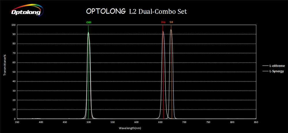 Basierend auf den Eigenschaften von Emissionslinien im Weltall und Emissionslinien der Lichtverschmutzung bewahrt das L2 Dual-Combo-Set die charakteristischen Farben von Nebeln in OIII, Hα und SII und filtert gleichzeitig den größten Teil der Lichtverschmutzung heraus. Es wurde speziell entwickelt und optisch optimiert und weist das folgende Transmissionsprofil auf: