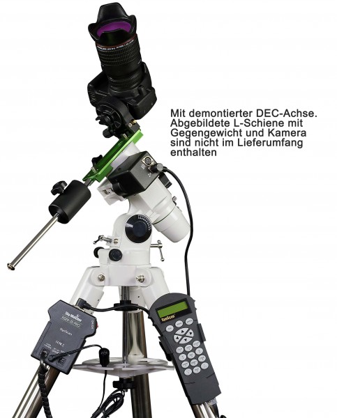 Auf Reisen können Sie die DEC-Achse zusammen mit der schweren Gegengewichtsstange und den Gegengewichten entfernen, wodurch das Gewicht des Instruments erheblich reduziert wird. In dieser Konfiguration können Sie eine einfache 45-mm-Schwalbenschwanzplatte mit Stativschraube (nicht mitgeliefert) verwenden und Ihre Kamera direkt mit einem Kugelkopf (nicht im Lieferumfang enthalten) montieren. Alternativ kann eine DSLR auf einer Sky-Watcher Star Adventurer L-Schiene (nicht im Lieferumfang enthalten) montiert werden. Wenn die Dec-Achse entfernt wurde, wird lediglich die RA-Achse nachgeführt und Sie können problemlos Fotos aufnehmen. Nun funktioniert die Montierung so ähnlich wie der StarAdventurer, nur die Zuladung ist höher!