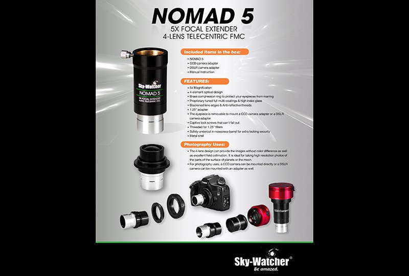 Die neue Sky-Watcher Nomad-5 5-fach Telezentrische Barlow ist ein optisches Zubehör von höchster Qualität mit einem breiten Feld von Anwendungen für die visuelle Beobachtung und Fotografie.