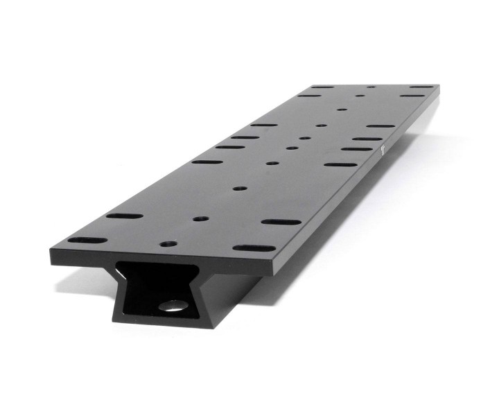 Diese Prismenschiene ist auch für schwere und lange Teleskope geeignet. Durch Profilbauweise wird wertvolles Gewicht gespart bei gleichzeitig optimaler Steifigkeit. Vibrationen werden zuverlässig verhindert. Acht Langlöcher für 1/4" und M6 ermöglichen eine flexible Adaption von Rohrschellen und Teleskopen mit Abstände von 59 mm bis 80 mm an die Schiene. Zusätzlich gibt es zehn zentrale Löcher und vier 1/4"-Fotostativgewinde an der Basis.