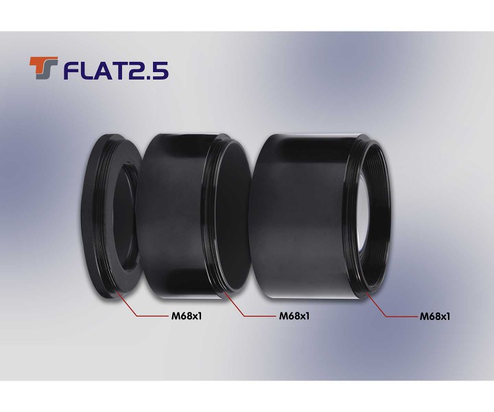 Der TSFLAT25G2 ist für Refraktoren mit 2,5"- oder größeren Okularauszügen geeignet. Selbstverständlich wird der Korrektor mit dem Okularauszug verschraubt. An der Teleskopseite steht dafür ein M68x1-Außengewinde zur Verfügung. Mit im Lieferumfang ist auch ein Adapter von M68x1 auf M63x1 enthalten, für alle Auszüge, die ein M63x1-Innengewinde haben.