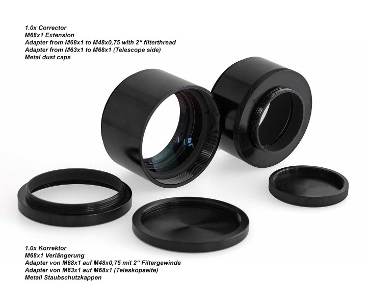 - 2,5"-Korrektor im robusten Metallgehäuse mit teleskopseitigem M68x1-Außengewindeanschluss und kameraseitigem M68x1-Innengewindeanschluss