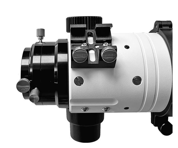 Der Okularauszug hält Zubehör bis etwa 5 kg, ohne zu verkippen. Die Verstellung des Auszugrohres erfolgt über eine Zahnstange. Sie ist von der Lagerung selbst entkoppelt. Das ermöglicht auch bei Maximalbelastung eine feinfühlige Verstellung. Die 1:11-Mikrountersetzung bietet auch für Astrofotografie eine genaue Einstellmöglichkeit.