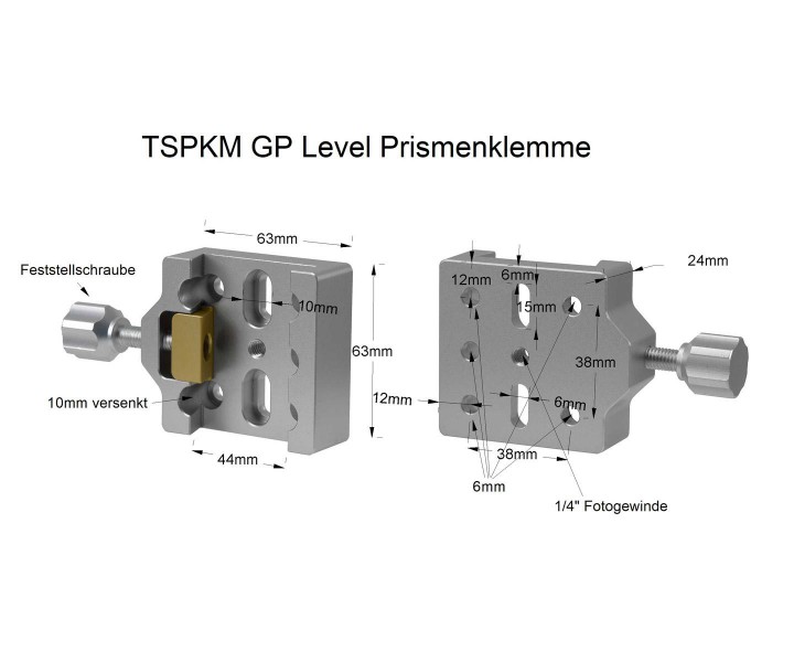 Extrem flexibel durch 7 versenkte BohrlöcherZur Befestigung der Prismenklemme stehen Ihnen 7 Bohrlöcher zur Verfügung. Fünf Löcher für M6- und 1/4"-Schrauben (im Abstand von 38 mm quadratisch, ein M6-Bohrloch mittig) und zwei Löcher für M8-Schrauben . Die Funktionen, insbesondere die Klemmung, bleiben voll erhalten. Die Klemmschraube kann ohne Probleme bedient werden.