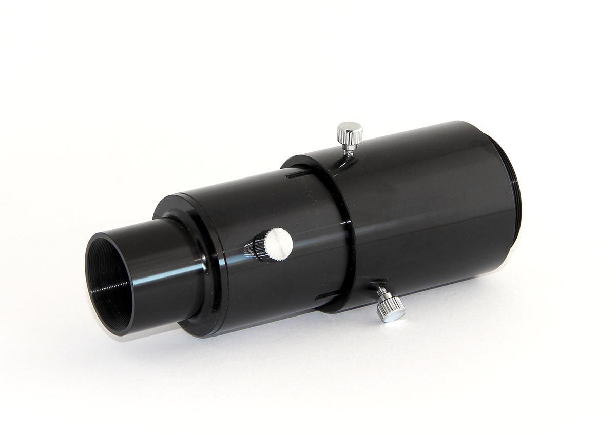 Bei Fokalfotografie wird kein Okular verwendet. Die Kamera (natürlich ohne Objektiv) wird mit dem T2-Ring direkt an das Fernrohr befestigt. Das Teleskop wird zu einem Teleobjektiv umfunktioniert.Schrauben Sie einfach die 1,25"-Steckhülse vom Adapter runter und schrauben Sie den T2-Ring an die Steckhülse. Dann stecken Sie die Kombination in den Okularauszug, befestigen Ihre Kamera und können loslegen.Achtung, verschiedene Teleskope (z.B. kleine Newton-Teleskope) sind nicht für diese Art von Fotografie geeignet. Sie kommen nicht in den Schärfebereich, Okularprojektion funktioniert aber.