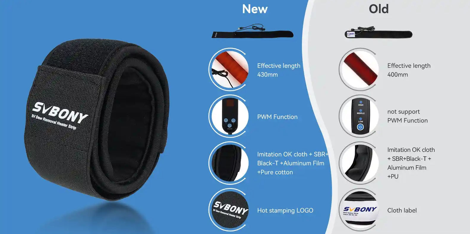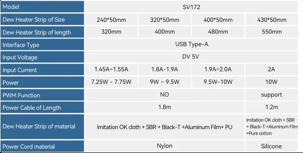 | Technische Daten | | Modell | W9132A | W9132B | W9132C | W9132D | | Gesamtlänge | 320 mm | 400 mm | 480 mm | 550 mm | | Heizungslänge | 240 mm | 320 mm | 400 mm | 430 mm | | Schnittstellentyp | USB Typ A | USB Typ A | USB Typ A | USB Typ A | | Eingangsspannung | DV 5V | DV 5V | DV 5V | DV 5V | | Eingangsstrom | 1,55 Ampere | 1,8 A bis 1,95 A | 1,9 A bis 2,2 A | 2A | | Leistung | 7,25 W – 7,75 W | Neun Watt – Neuneinviertel Watt | 9,5 W–9,75 W | 10 W | | Temperatur einstellbar | Ja | Ja | Ja | Ja | | PWM-Funktion | Nein | Nein | Nein | Unterstützung | | Länge des Stromkabels | 1,8 m | 1,8 m | 1,8 m | 1,2 m | | Streifenmaterial | Imitation OK-Gewebe + SBR + Black-T + Aluminiumfolie + PU | Imitation OK-Stoff + SBR + Black-T + Aluminiumfolie + reine Baumwolle | | Material des Netzkabels | Nylon | Nylon | Nylon | Silikon | | Geeignet für OTA | | SV503 70ED | SV48P 90, SV503 80ED, SV550 80APO | MK105, SV48P 102, SV503 102ED |