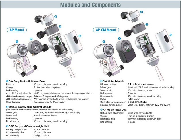 Die AP-SM Montierung ist die Erweiterung zur AP Montierung. Im Gegensatz zur AP Montierung, verfügt sie jedoch über einen RA Motor und ist mit der STARBOOK ONE Steuerung ausgestattet.