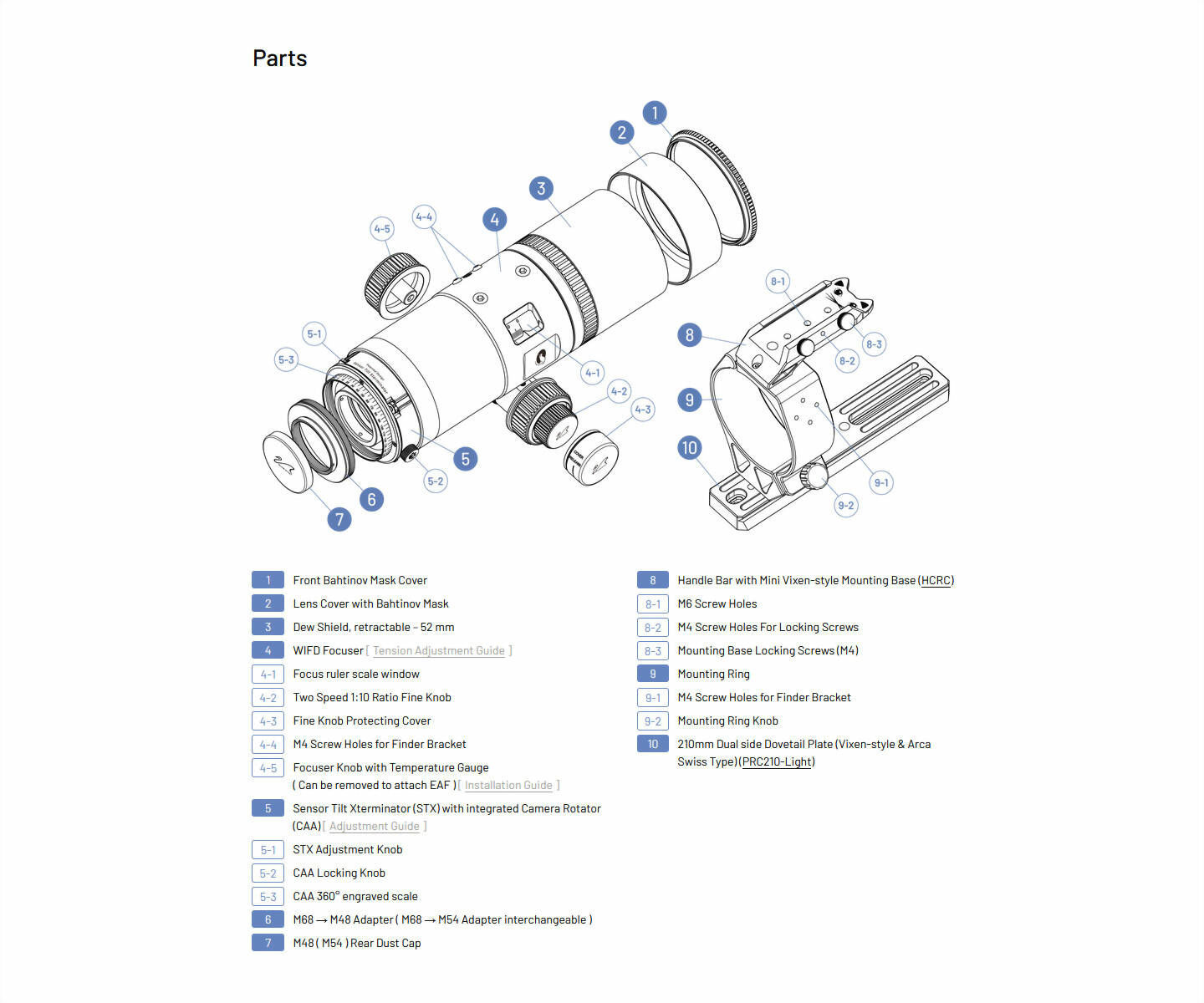 Das fortschrittliche 5-Elemente-Petzval-Design eliminiert die Bildfeldwölbung und liefert ohne zusätzlichen Flattener scharfe Bilder. 50 mm großer Bildkreis: Unterstützt Vollformatkameras, APS-C- und M4/3-Sensoren für optimale Leistung. Begrenzt kompatibel mit Mittelformat. Schnelle f/4,8-Optik: Hervorragende Lichtsammelfähigkeit, die Deep-Sky-Aufnahmen mit kürzeren Belichtungszeiten ermöglicht. Der patentierte WIFD-Okularauszug (WIFD: William Internal Focuser Design) ist in den Tubus integriert. Diese spezielle Konstruktion erlaubt präzises Scharfstellen und vermeidet Verkippungen auch bei schweren Kameras. Der Okularauszug ist EAF-kompatibel. Kameraseitig ist der Tubus mit einem Rotator und einem Neigeflansch ausgestattet. Ersterer erlaubt die Drehung der Kamera für die perfekte Ausrichtung des Sensors zum Motiv, letzerer ermöglicht das exat parallele Ausrichten des Kamerasensors zur Bildebene, wodurch Bildfehler vermieden werden. Temperaturstabile Linsenzellen minimieren die thermische Ausdehnung und Kontraktion und sorgen für eine perfekte optische Ausrichtung in jeder Umgebung. Das Teleskop wird mit einer Bahtinovmaske geliefert, die im Objektivdeckel integriert ist. Diese Maske erleichtert das Scharfstellen. Hochwertige Konstruktion und ergonomisches Design: Leichte und dennoch robuste Konstruktion mit eleganter eloxierter Oberfläche. Das patentierte Design des Handgriffs sorgt für mehr Flexibilität und Benutzerfreundlichkeit. Vielseitige Kamera-Kompatibilität: Es sind Adapter für Canon EF-, RF-, Nikon F-, Z-, Sony E-, Pentax K-, MFT- und FUJI X erhältlich.