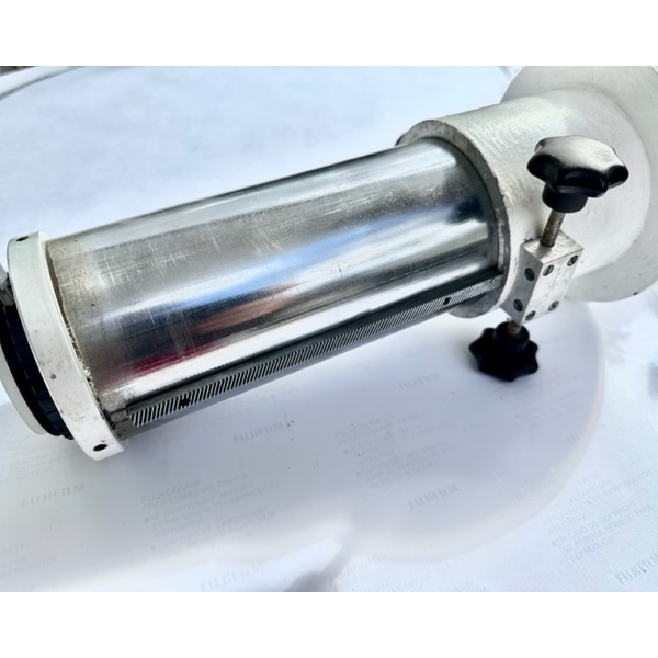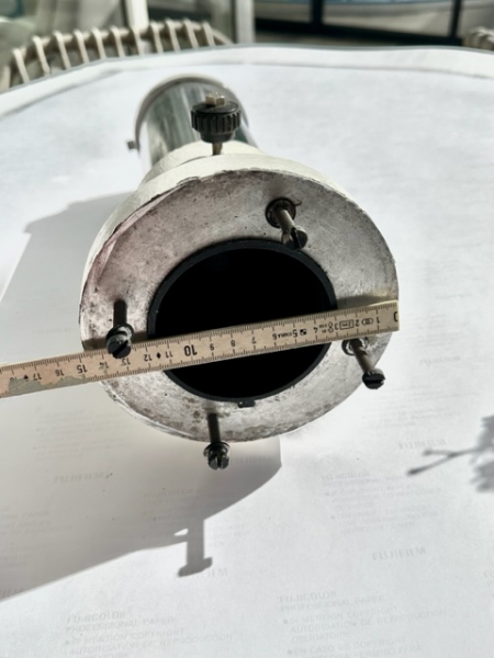 Okulartauszug mit Zahntrieb 82 mm, vermutlich von Fa. Wachter, Gewicht 4100 gramm, 180 mm Fokusierweg, Durchmesser Aufnahmeflansch 148 mm, kürzeste Baulänge 140 mm, Durchmesser Fokusierrohr 90,70 mm mit 84 mm Innengewinde am Ende, inklusive 2" Baader Klemme. Hersteller unbekannt, vermutlich Fa. Wachter