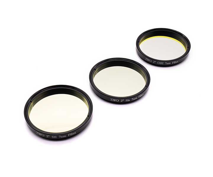 Schmalband-Nebelfilter heben den Kontrast des Objektes deutlich an und schalten die Lichtverschmutzung aus. Durch die Bandbreite von 7 nm gelingen Aufnahmen mit extremen Kontrast, auch aus Stadtnähe. ZWO Filter sind untereinander homofokal. Das Filterset besteht aus: