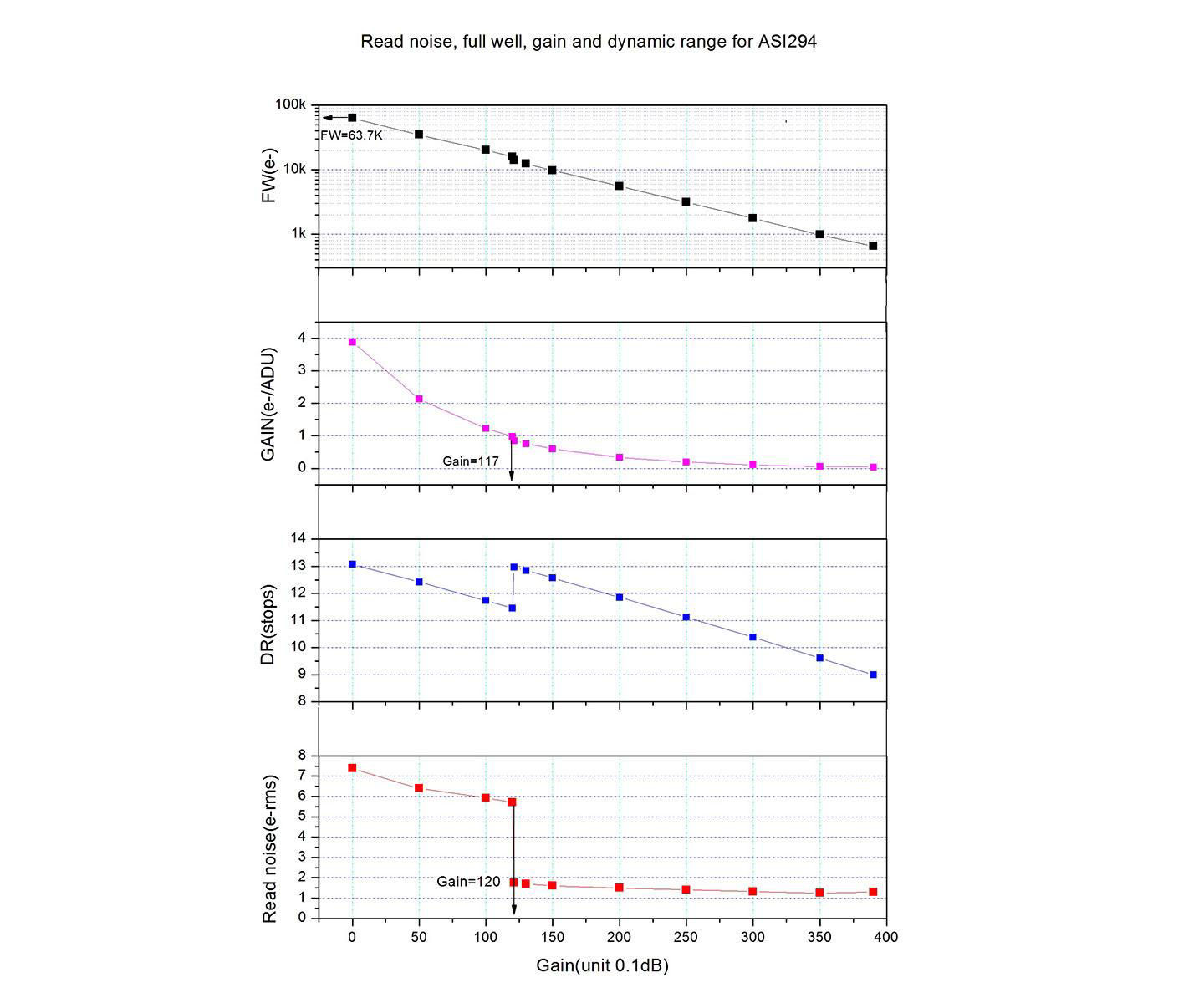 - 14bit-ADC HCG Modus - wenn Gain (Vorverstärkung) höher als 120 (12 dB) ist, wird das Ausleserauschen unter 2 e- reduziert. Ergebnis: trotz extrem hoher Empfindlichkeit erhalten Sie rauscharme Bilder. Full Well Capacity 63700 e - selbst helle Sterne brennen nicht mehr aus, sie erhalten ein besseres Signal-Rausch-Verhältnis.