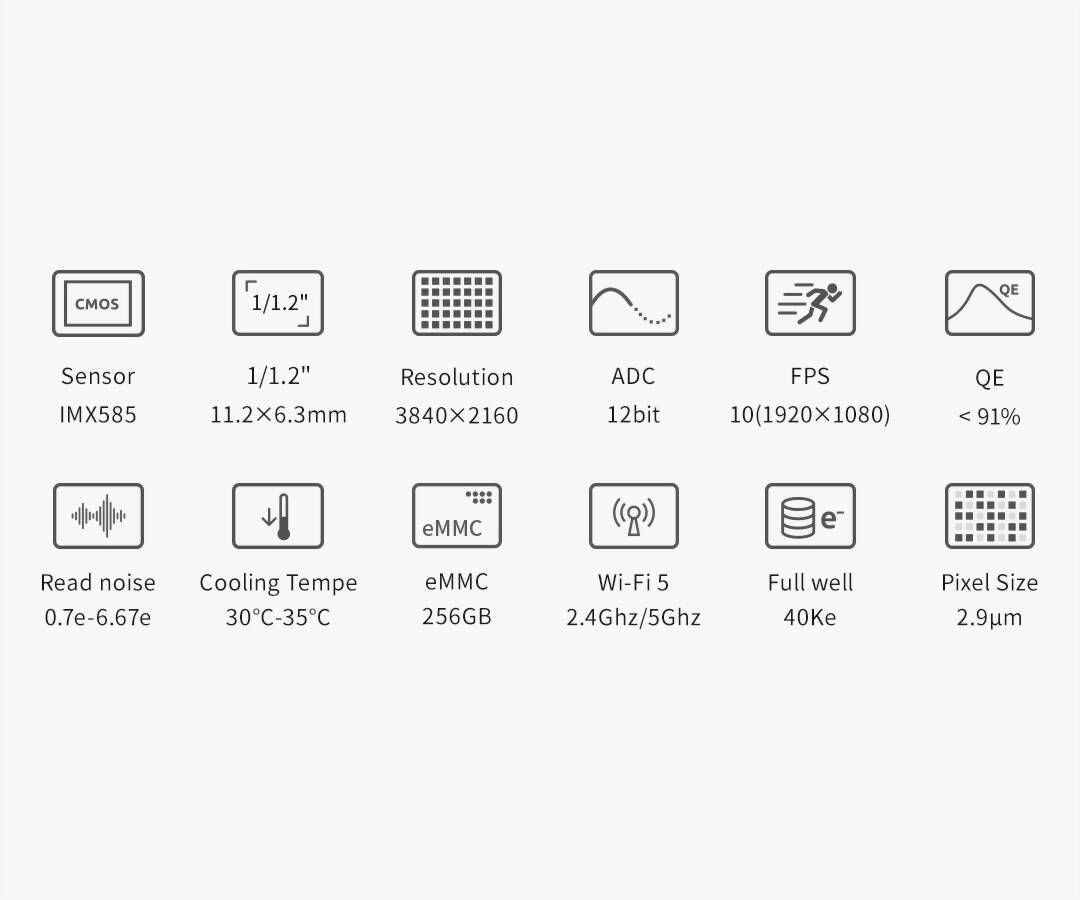 Der Hauptsensor IMX585 hat das 1/1,2-Zoll-Format und 8,28 MP insgesamt. Die Größe beträgt 11,2 mm in der Breite x 6,3 mm in der Höhe und die Diagonale beträgt 13,2 mm. Die kleine Pixelgröße von 2,9 µm x 2,9 µm bietet eine hohe Auflösung sowie eine gute Full-Well-Kapazität von 40 ke.