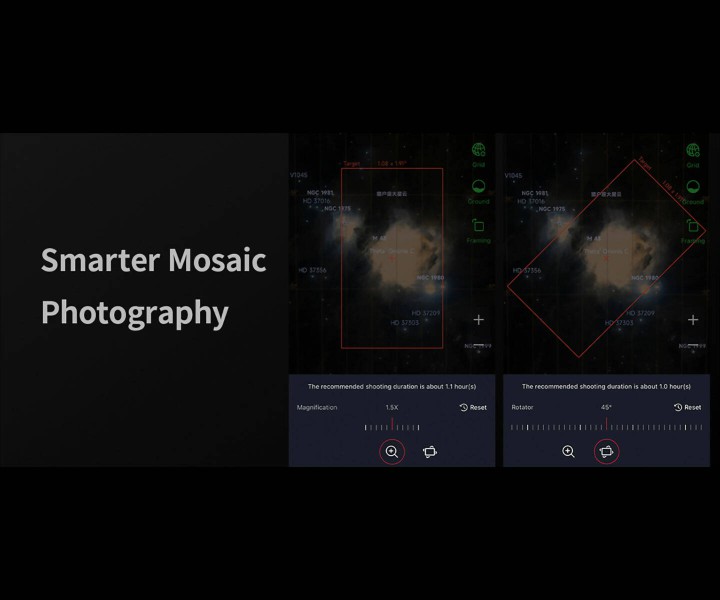 Die Bildbearbeitung auf Knopfdruck reduziert das Bildrauschen und bewahrt gleichzeitig die Details der Himmelsobjekte, sodass selbst in stark lichtverschmutzten Bereichen brillante Bilder entstehen. Außerdem können Sie den Bildstil ganz nach Ihrem Geschmack anpassen und Ihre beeindruckenden Aufnahmen sofort mit anderen teilen.