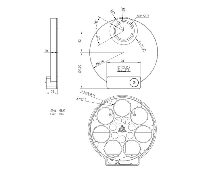 Das Kernstück des EFW ist der Schrittmotor, der mit zuverlässiger Leistung und Qualität aus dem Hause NPM, Japan, kommt. Das elektrische 2"-Filterrad kann zur Filterauswahl sowohl gegen als auch im Uhrzeigersinn gedreht werden.