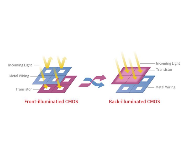Der hintergrundbeleuchtete CMOS-Sensor verbessert die Empfindlichkeit und die Rauschunterdrückung - die Schlüsselfaktoren zur Verbesserung der Bildqualität - durch die Änderung der grundlegenden Pixelstruktur von der Vorder- zur Rückseitenbeleuchtung. Die Vorteile der CMOS-Bildsensoren, wie geringer Stromverbrauch und Hochgeschwindigkeitsbetrieb, wurden beibehalten.