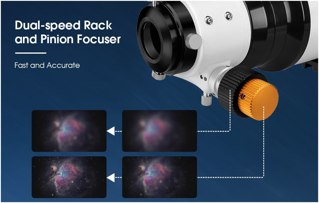Among the telescope’s key strengths is its excellent price-performance ratio. Users praise the solid optical quality and robust construction at a very reasonable price. The ED glass correction ensures clean, high-contrast images without the distracting color fringes often found in standard achromatic refractors. The mechanical build quality is also impressive: the focuser operates smoothly and precisely, and the optical tube feels well-made and sturdy. Additionally, the comprehensive accessory package — including tube rings, an adapter, and a Vixen-style dovetail plate — makes setup quick and convenient.