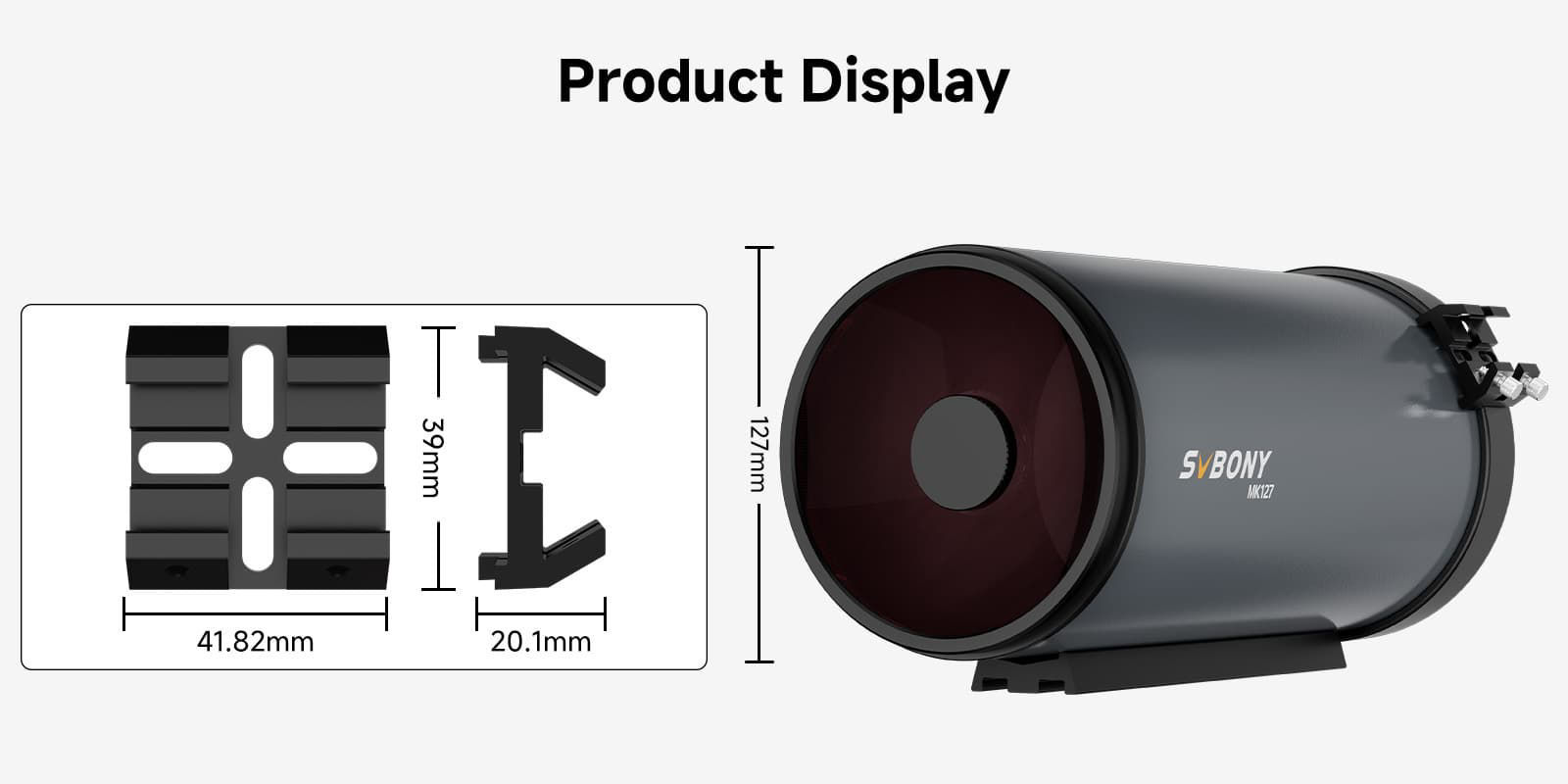 | Technical Data | | Brand | SVBONY | SVBONY | SVBONY | | Model | MK127 | MK105 | MK90 | | Type | Maksutov-Cassegrain optics | Maksutov Cassegrain | Maksutov Cassegrain | | Aperture | 127mm | 105mm | 90mm | | Focal Length | 1500mm | 1365mm | 1250mm | | Focal Ratio | f/11.8 & f/7.15(w/ Focal Reducer) | f/13 | f/13.9 | | Light Gathering Power | 254X | 210x | 180x | | Primary Mirror | Multi-coated Precision Aluminum Coating | Multi-coated Precision Aluminum Coating | Multi-coated Precision Aluminum Coating | | Secondary Mirror | 99% Reflectivity Dielectric Coatings | Multi-coated Precision Aluminum Coating and Multi Coating | Multi-coated Precision Aluminum Coating and Multi Coating | | Focuser | Internal Dual Speed | Internal | Internal | | Mounting | Vixen Style | Vixen Style | Vixen Style | | Mounting Base Number | 2PCS | 1PCS | 1PCS | | Outer Diameter | 145mm | - | - | | Reflectance of High-Reflective Dielectric Coating | 99% | 82% | over 89% | | Net Weight | 2934g / 6.47lb | 2193g | 1380g | | Adapter Thread | SCT Male thread (2" 24TPI) | M42x0.75 for T-ring | M42x0.75 for T-ring | | Accessories | 0.65x Focal Reducer; SCT -2" Mount Adapter; SCT to 1.25" Mount w/ T Adapter | Dovetail Mounting Base, Dovetail Plate 160mm | Dovetail Mounting Base, Dovetail Plate 70mm | | Package Dimension | | / | 360x170x170mm |